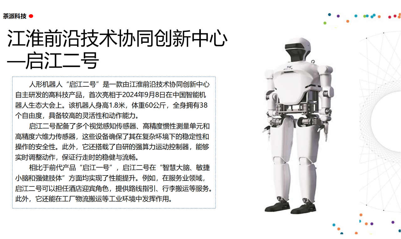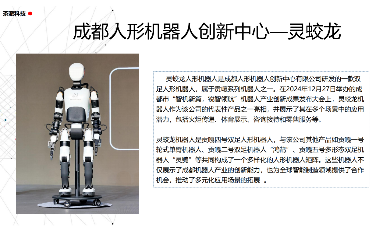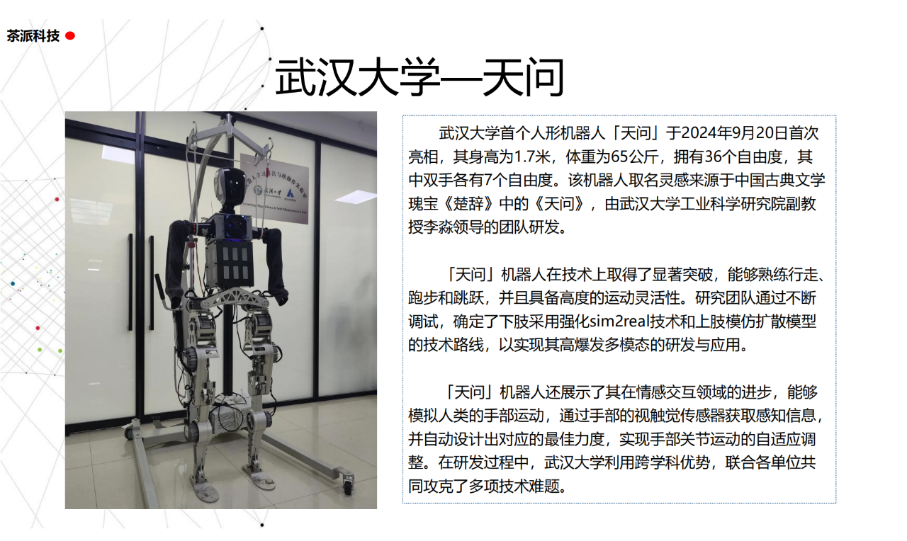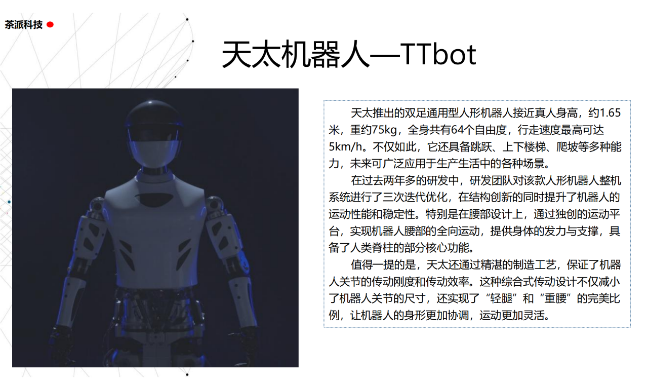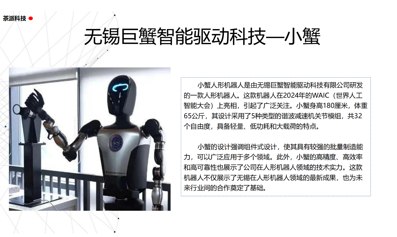 從實驗室到生產線,從概念設想到產品落地,中國人形機器人領域迎來了前所未有的井噴式發展。一款款設計精巧、功能強大的人形機器人如雨后春筍般涌現,它們或靈巧如舞者,或力大無窮,更不乏擁有情感交互能力的“智慧伴侶”。這不僅是對技術極限的一次次挑戰,更是對“中國制造”向“中國智造”跨越的生動詮釋。??在這一波人形機器人浪潮中,無數初創團隊猶如璀璨星辰,他們懷揣夢想,勇于探索未知。每一個深夜的燈火,每一次算法的迭代,都是對未知世界的勇敢叩問。正是這些充滿激情與創造力的團隊,為人形機器人產業注入了源源不斷的活力與希望。??作為深耕機器人應用場景研究的先行者,武漢茶派科技深知責任重大。在這一年里,我們積極擁抱變革,密切關注中國人形機器人產業的每一步成長。我們愿做那座橋梁,連接百家智慧,匯聚行業力量,共同推動人形機器人從技術的象牙塔走向廣闊的應用市場,讓科技之光溫暖每一個角落。??展望2025,我們滿懷期待。隨著技術的不斷迭代與應用的持續深化,人形機器人將不再只是展臺上的明星,而是真正成為我們生活的一部分。它們將穿梭于家庭、醫院、工廠、學校……以更加人性化、智能化的方式服務人類,成為我們不可或缺的伙伴與朋友。??在這一年的尾聲,讓我們向所有為中國機器人產業發展默默奉獻的科研工作者致以最崇高的敬意!是你們,用智慧和汗水鋪就了通往未來的智能之路。2025,讓我們攜手并進,共同見證人形機器人從夢想走進現實,開啟一個屬于所有人的智能新時代!??加入我們,一起見證并參與這場科技革命,讓未來因你我而更加精彩!