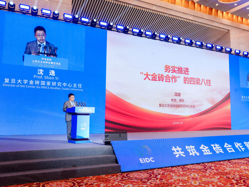 在主題演講環節,復旦大學金磚國家研究中心主任沈逸教授做了《務實推進“大金磚合作”的四梁八柱》的演講,他首先回顧了“大金磚合作”的“三年演進”,并表示金融聯通、綠色轉型、數字智能、人文賦能的“四梁”,以及本幣與支付、NDB融資、綠色鏈、AI與數據、教育與科研平臺、合規治理、標準互認、匯率與流動性管理的“八柱”,構成了企業參與“大金磚合作”的可操作框架。