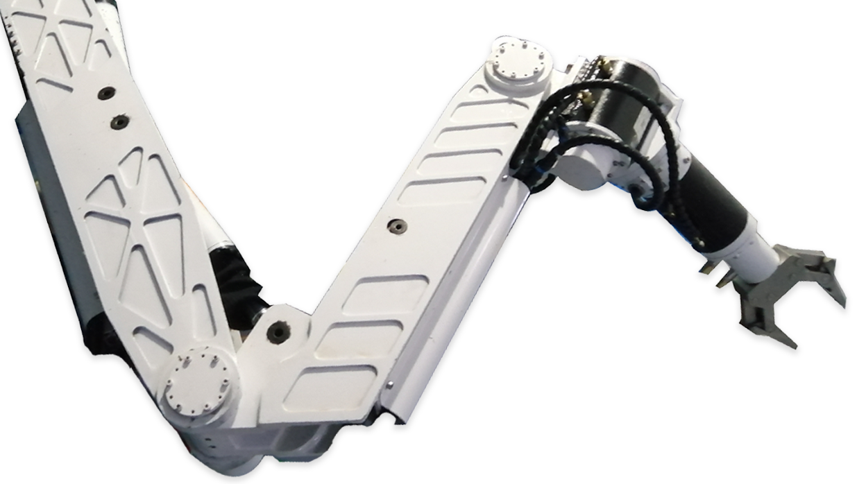多自由度關節,全液壓驅動、高功率密度、大臂展、低自重比、少電氣組件、高抗電磁干擾。